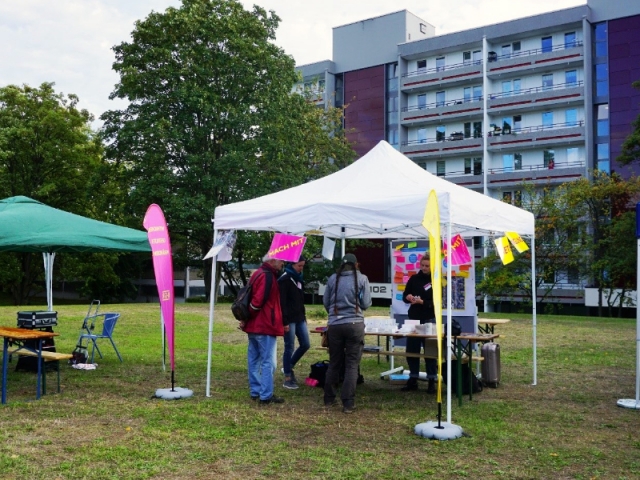 Bei diversen Beteiligungsveranstaltungen wurden die Möbel für den Nachbarschaftspavillon von den Bewohner:innen selber gebaut und in den BGR-Farben lackiert. Der Nachbarschaftspavillon steht allen Bewohner:innen und Institutionen kostenfrei zur Verfügung. Hier finden regelmäßig Aktionen, Treffen und Veranstaltungen statt. Interessenten können sich jederzeit beim Quartiersmanagement melden.