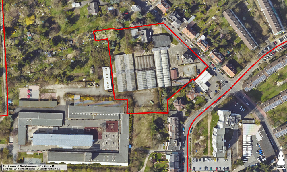 Das Plangebiet wird im Nordosten von der Dortelweiler Straße und im Südosten von einem allgemeinen Wohngebiet an der Comeniusstraße begrenzt. Im Süden und Südwesten grenzen die Flächen an den Günthersburgpark an. Das Plangebiet umfasst rund 1,15 Hektar.