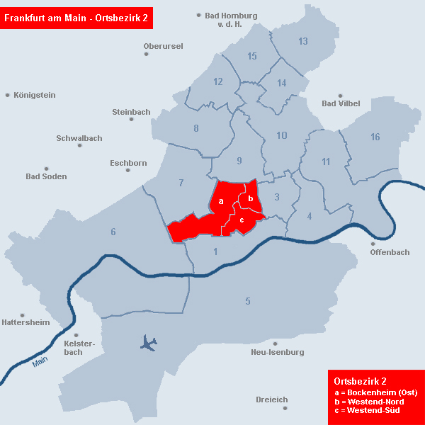 Der Ortsbezirk 2 (Innenstadt II) umfasst die Stadtteile Westend-Nord und Westend-Süd sowie den größten Bereich des Stadtteils Bockenheim.