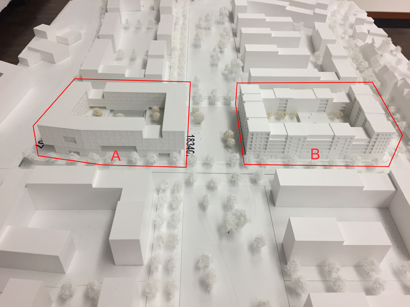 Modellfoto der Siegerentwürfe, Baufeld A: Ackermann + Raff, Baufled B: Menges Scheffler Architekten © Stadtplanungsamt Stadt Frankfurt am Main