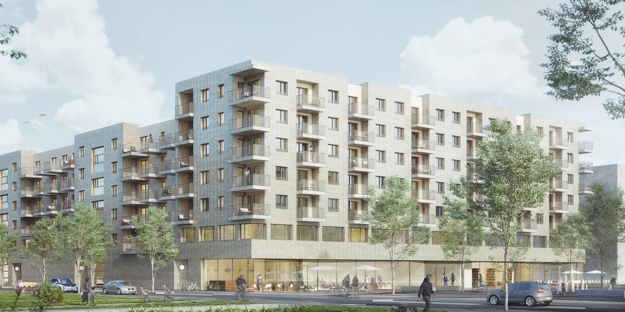 Instone Real Estate wird in dem nördlich des zentralen Platzes gelegenen Gebäude die Nahversorgung des neuen Quartiers realisieren: zwei Supermärkte, mehrere Einzelhandelsgeschäfte und eine zum Quartiersplatz hin ausgerichtete Gastronomie. Im ersten Obergeschoss liegen Arztpraxen oder Büros sowie eine Kindertagesstätte im Innenbereich. Die restlichen Flächen und alle übrigen Obergeschosse bleiben dem Wohnen vorbehalten. Menges Scheffler Architekten orientieren sich in ihrem Siegerentwurf an der Blockrandbebauung als Grundgerüst für eine hybride Gebäudenutzung. Mit unterschiedlichen Gebäudehöhen reagieren sie dabei auf die angedachte umliegende Bebauung. Der Wohnungsbau mit seinen unterschiedlichen Gebäudetiefen profiliert und gliedert die Baukörper zusätzlich. Auch hier soll ein Teil der Wohnungen öffentlich gefördert werden.