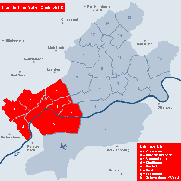 Der Ortsbezirk 6 (West) umfasst die Stadtteile Zeilsheim, Unterliederbach, Sossenheim, Sindlingen, Höchst, Nied und Griesheim sowie den westlichen Bereich des Stadtteils Schwanheim bis zur Autobahntrasse A5.
