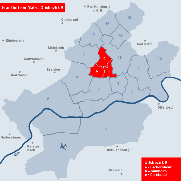 Der Ortsbezirk 9 (Mitte-Nord) umfasst die Stadtteile Eschersheim, Ginnheim und Dornbusch.