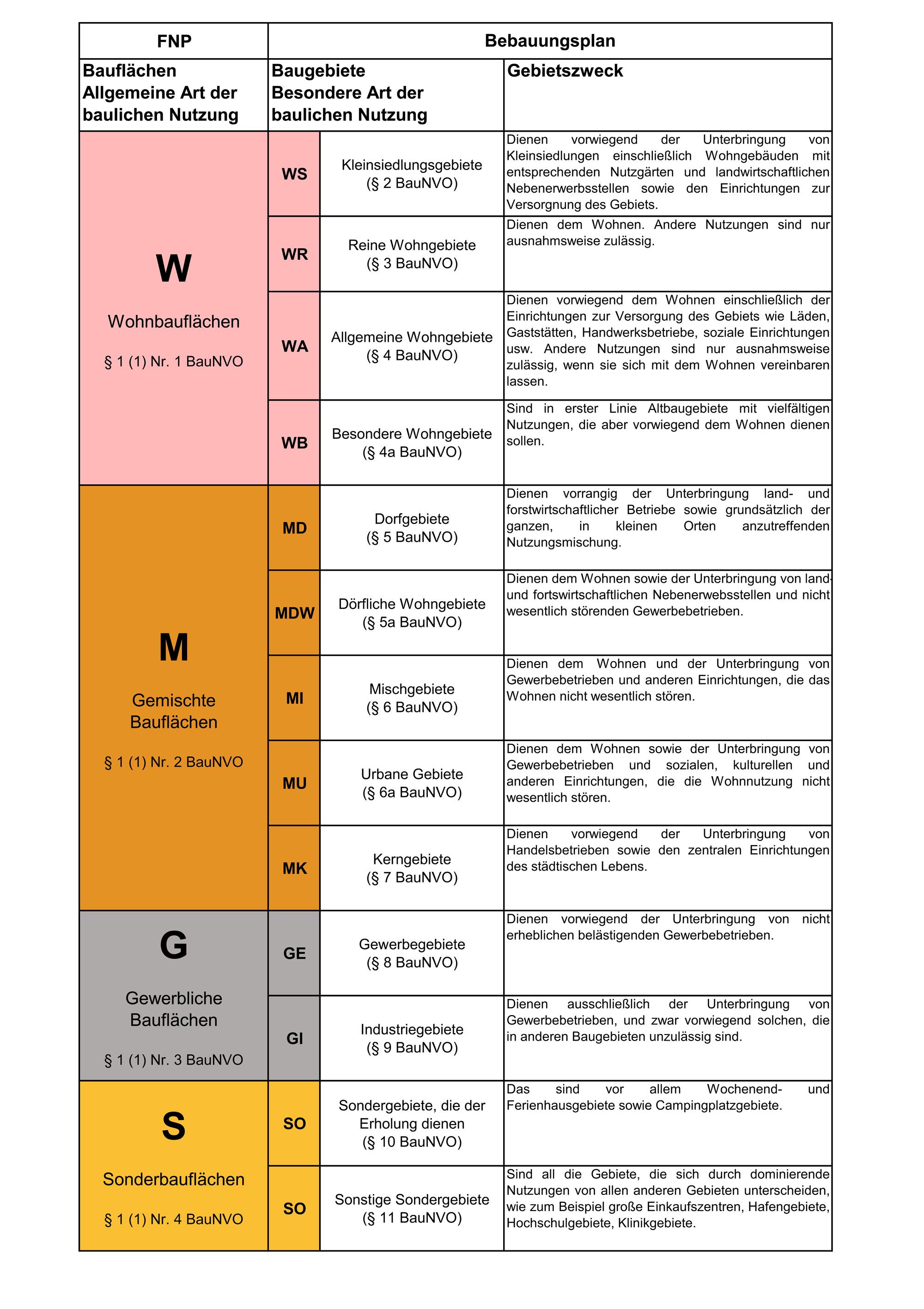 Die Art der baulichen Nutzungen bestimmt, in welcher Art ein Grundstück genutzt werden kann und ob zum Beispiel Wohngebäude, Handwerksbetriebe, Tankstellen oder sonstige Vorhaben zulässig sind. Je nach ihrer Zweckbestimmung können verschiedene Baugebietstypen nach § 1 (2) Baunutzungsverordnung (BauNVO) im Bebauungsplan festgesetzt werden: Kleinsiedlungsgebiete (WS), reine Wohngebiete (WR), allgemeine Wohngebiete (WA), besondere Wohngebiete (WB), Dorfgebiete (MD), dörfliche Wohngebiete (MDW), Mischgebiete (MI), urbane Gebiete (MU), Kerngebiete (MK), Gewerbegebiete(MK), Industriegebiete (GI) und Sondergebiete (SO). Der Bebauungsplan konkretisiert dabei die allgemeinen Baugebietsflächen des Flächennutzungsplans.