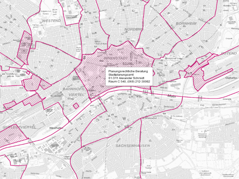 Ausschnitt planAS - Vorbehaltsgebiete, Ansprechpartner planungsrechtliche Beratung, © Stadtplanungsamt Frankfurt am Main