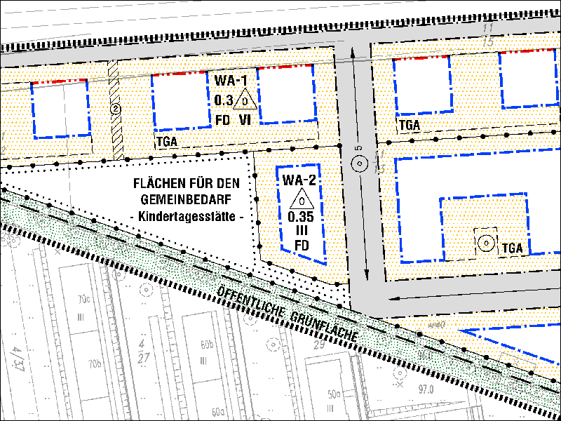 Die grundstücksbezogenen Festsetzungen der Bebauungspläne regeln die bauliche und sonstige Nutzung von Grund und Boden allgemeinverbindlich. Die Bebauungspläne bestimmen somit wesentliche bauplanungsrechtliche Voraussetzungen, unter denen für Bauvorhaben Baugenehmigungen erteilt werden. Ein Bebauungsplan ist ein Ortsgesetz (eine Satzung), aus der sich Rechte und Pflichten für die betroffenen Bürger unmittelbar ableiten.  Mehr...