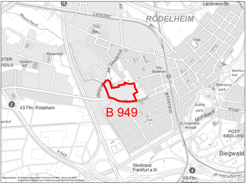 Die Beschlussfassung über die Aufstellung des Bebauungsplanes Nr. 949 - Östlich A5 / Eschborner Landstraße - Teilbereich 2 - wurde am 24.02.2026 im Amtsblatt Nr. 9 der Stadt Frankfurt am Main bekannt gemacht.