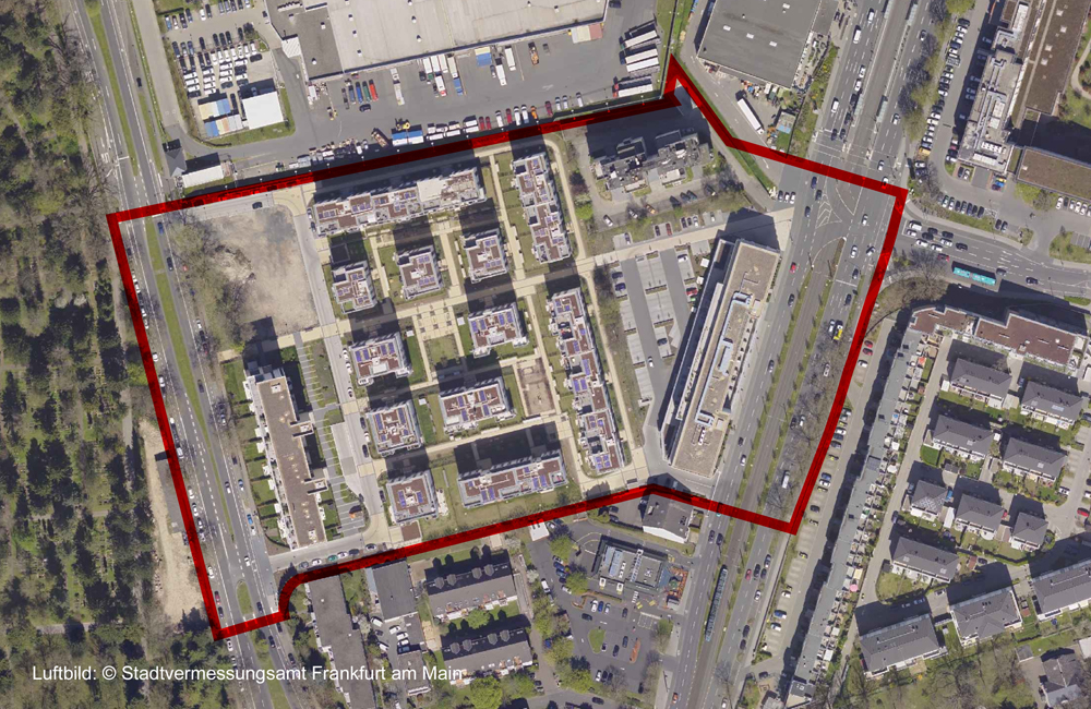 Beispiel Beschleunigtes Verfahren, Luftbild 2015 - Ausschnitt Plangebiet mit Geltungsbereich nach Durchführung des Bebauungsplanverfahrens Nr. 868 "Gießener Straße - ehemaliges Postgelände", © Stadtplanungsamt Stadt Frankfurt am Main