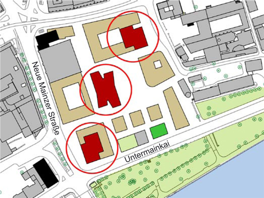 The remodeling of the former Degussa-site (the “Maintor” project) provides an opportunity to open up this previously sealed off quarter in the east of the old town. The objective in terms of urban development is to compact the building mass in order to be able to create space again for historical pathways and plazas. Continuing the height of existing high-rises along the northern front of the River Main, a total of three further high points are envisaged.