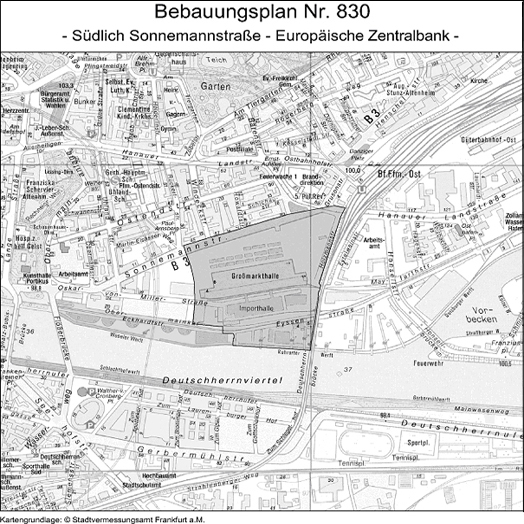 Der Aufstellungsbeschluss für den Bebauungsplan Nr. 830 „Südlich Sonnemannstraße - Europäische Zentralbank - wurde am 08.11.2001 gefasst.