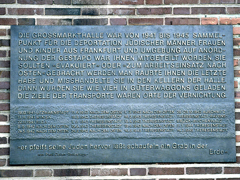 Die Stadt Frankfurt am Main beabsichtigt, eng abgestimmt mit der Europäischen Zentralbank (EZB) und der Jüdischen Gemeinde Frankfurt, in direkter Nachbarschaft zur ehemaligen Großmarkthalle eine Stätte der Erinnerung an die Deportation von mehr als 10.000 jüdischen Bürgern Frankfurts zu schaffen, die an diesem Ort versammelt und in die Konzentrationslager abtransportiert wurden.