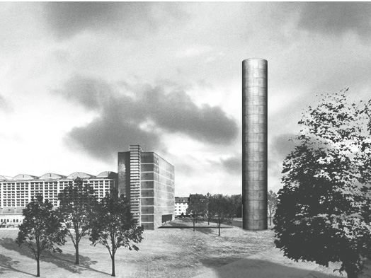 1. Preis: Coop Himmelb(l)au (Wien) mit dem Entwurf zweier miteinander verbundener, in sich verdrehter Türme über einem südlich der Großmarkthalle liegenden Flachbau