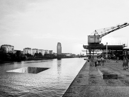 „’Absent Monument’ - Das abwesende Denkmal ist eine Interpretation der Deportation. Allein durch das Wegnehmen eines Teiles des Flusses wird die gleichförmige Bewegung des Wassers an genau dieser Stelle zu Fall gebracht. Der Besucher erlebt die Leere und begreift in sehr bildlicher Art und Weise den Ausschluss und die Vertreibung der Juden aus der Frankfurter Gemeinschaft.“
