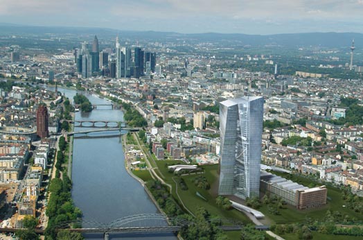 Der mit einem Atrium verbundene Doppelturm hat sich in seiner Gestalt gegenüber dem Wettbewerb kaum verändert. Besonders hervorzuheben ist der überarbeitete Freiflächenplan, der auch die Sicherheitsanforderungen der EZB über landschaftsplanerische Elemente löst. Im Nordosten wird die GrünGürtelverbindung, die künftig einen Teil der vorhandenen Lücke zwischen der Grundstücksgrenze der EZB und dem Bahndamm von der Sonnemannstraße bis zum Mainufer schließen wird, auf dem Grundstück der EZB optisch erweitert.