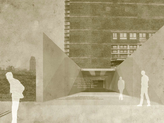 „Blick in die Erinnerung - Die Himmelsrichtungen der Konzentrations- und Vernichtungslager, in die die Verfolgten von Frankfurt aus deportiert wurden, bilden die Grundlage des Entwurfes. Die Umsetzung dieses Konzeptes erfolgt durch einen Turm, dessen neun Öffnungen in Richtung jener Lager weisen.“
