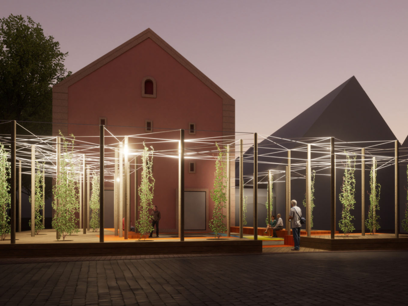 Wie beim Wettbewerbsbeitrag entsteht ein Sockel, auf den grünberankte Elemente montiert sind. Während beim Wettbewerbsbeitrag jedoch ein Rankgerüst vorgesehen ist, das fast die Höhe der ehemaligen Synagoge erreicht und dessen früheren Innenraum umschließt, erfolgt die Berankung bei der temporären Gestaltung an deutlich niedrigeren Holzpalisaden mit Seilverspannung. Die Gestaltung der Bodenfläche wird bereits bei der temporären Gestaltung aus der archäologischen Kartierung abgeleitet: So entsteht ein Bodenbild, das den Grundriss der ehemaligen Synagoge, aber auch andere historische Schichten ablesbar macht. Das Bodenbild wurde Anfang November 2025 realisiert, der Sockel mit den Palisaden soll dann 2026 folgen.
