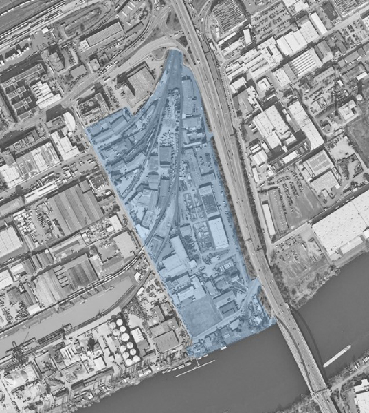 Das Plangebiet liegt im Stadtteil Ostend, im Bereich des Osthafens zwischen der Intzestraße und der A661 sowie südlich der Grundstücke an der Hanauer Landstraße bis zum Mainufer.
