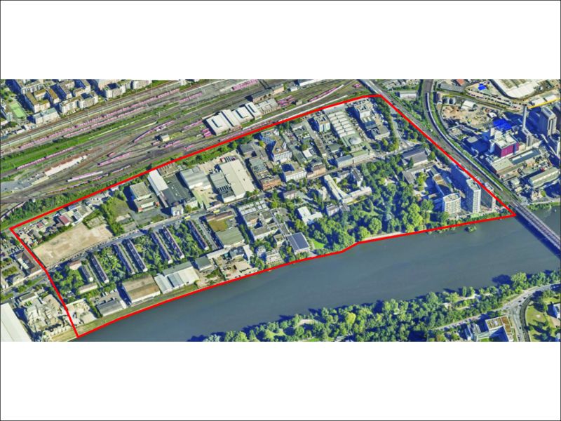 Das Entwicklungsgebiet erstreckt sich zwischen der Main-Neckar-Brücke im Osten, dem Briefverteilzentrum im Westen sowie dem Mainufer im Süden und dem Gleisvorfeld des Hauptbahnhofs im Norden.
