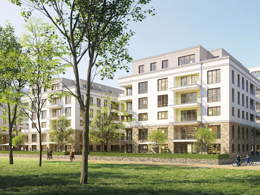Nicht nur die gute Lage im Stadtgebiet, sondern auch die aufgelockerte Bebauungsstruktur mit großen Grünflächen, sowie die räumliche Nähe zu Stadtwald und Main machen das Lyoner Quartier auch als Wohnstandort interessant.