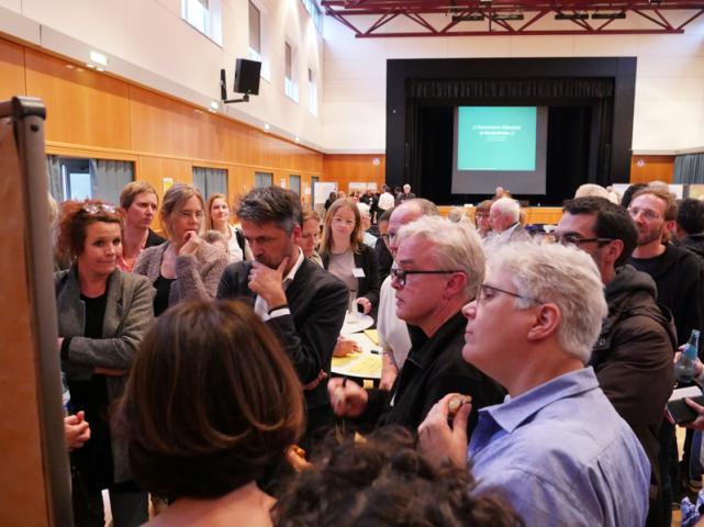 Im zweiten Teil der Veranstaltung hatten die Bürgerinnen und Bürger im sogenannten „Markt der Möglichkeiten“ die Gelegenheit, sich an verschiedenen Themeninseln über die Neuerungen und den weiteren Planungsprozess umfangreich zu informieren und sich aktiv mit Ideen, Wünschen und Anregungen einzubringen. Von besonderem Interesse waren im Rahmen dieser Diskussionsforen Lösungsvorschläge für eine optimale und vom Bestandsquartier unabhängige Erschließung des neuen Schulstandorts. Weitere Anregungen bezogen sich auf die Gestaltung und das pädagogische Konzept der neuen Grundschule. Aber auch der weitere Umgang mit dem Wäldchen und den westlich davon liegenden Freizeitgärten beschäftigte die Anwesenden.