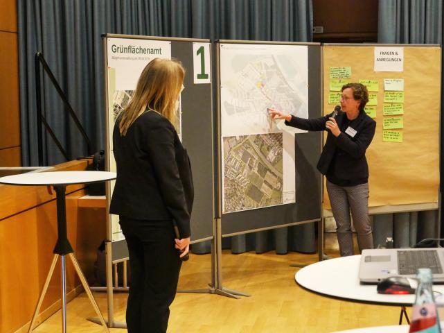 • Markt der Möglichkeiten: Heike Appel, Leiterin der Abteilung Planung und Bau erläutert Bürgern und Bürgerinnen Fakten zum Projekt © Stadtplanungsamt Stadt Frankfurt am Main