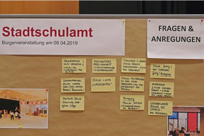 Im zweiten Teil der Veranstaltung hatten die Bürgerinnen und Bürger im sogenannten „Markt der Möglichkeiten“ die Gelegenheit, sich an verschiedenen Themeninseln über die Neuerungen und den weiteren Planungsprozess umfangreich zu informieren und sich aktiv mit Ideen, Wünschen und Anregungen einzubringen. Von besonderem Interesse waren im Rahmen dieser Diskussionsforen Lösungsvorschläge für eine optimale und vom Bestandsquartier unabhängige Erschließung des neuen Schulstandorts. Weitere Anregungen bezogen sich auf die Gestaltung und das pädagogische Konzept der neuen Grundschule. Aber auch der weitere Umgang mit dem Wäldchen und den westlich davon liegenden Freizeitgärten beschäftigte die Anwesenden.