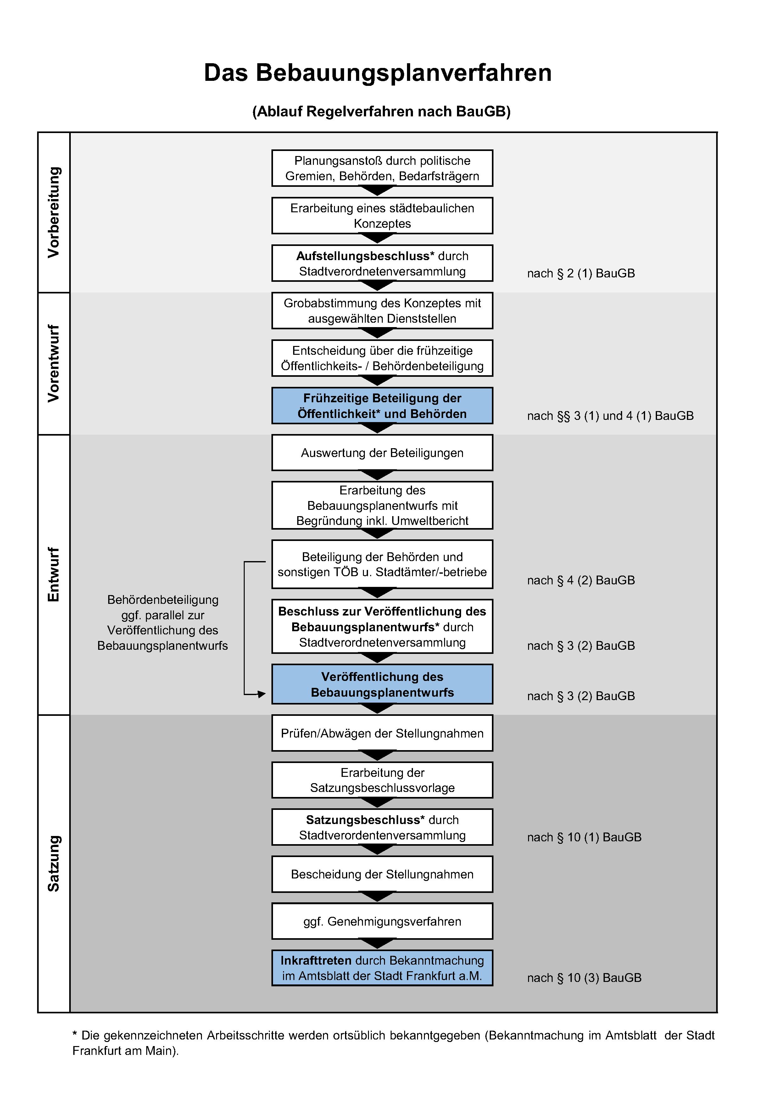 Ein „Standard-Bebauungsplanverfahren" läuft nach folgendem im Baugesetzbuch (BauGB) geregelten Verfahren ab: