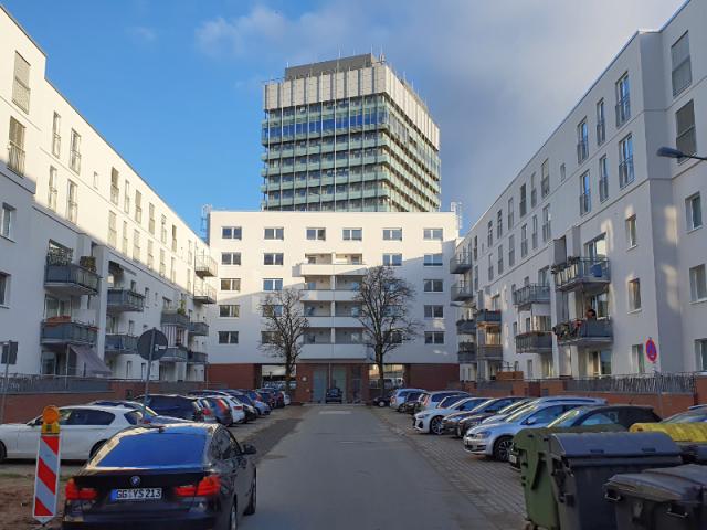 Die notwendigen zusätzlichen Pkw-Stellplätze werden in Tiefgaragen unter den neu entstehenden Höfen untergebracht. Die sehr schmalen Gehwege in der Sudermannstraße und in den vorhandenen Stellplatzachsen sollen auf mindestens 2,50 Meter verbreitert werden.