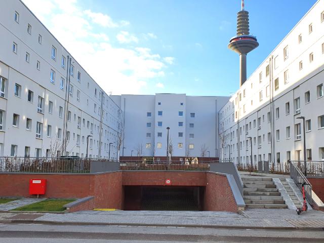 Die notwendigen zusätzlichen Pkw-Stellplätze werden in Tiefgaragen unter den neu entstehenden Höfen untergebracht. Die sehr schmalen Gehwege in der Sudermannstraße und in den vorhandenen Stellplatzachsen sollen auf mindestens 2,50 Meter verbreitert werden.
