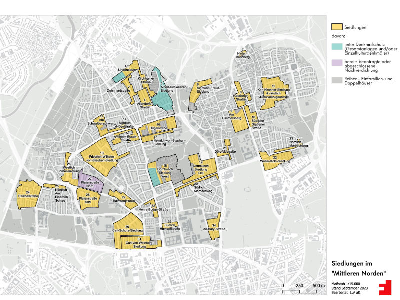 • bei denen eine Nachverdichtung bereits beantragt oder abgeschlossen ist (z.B. Platensiedlung Nord)