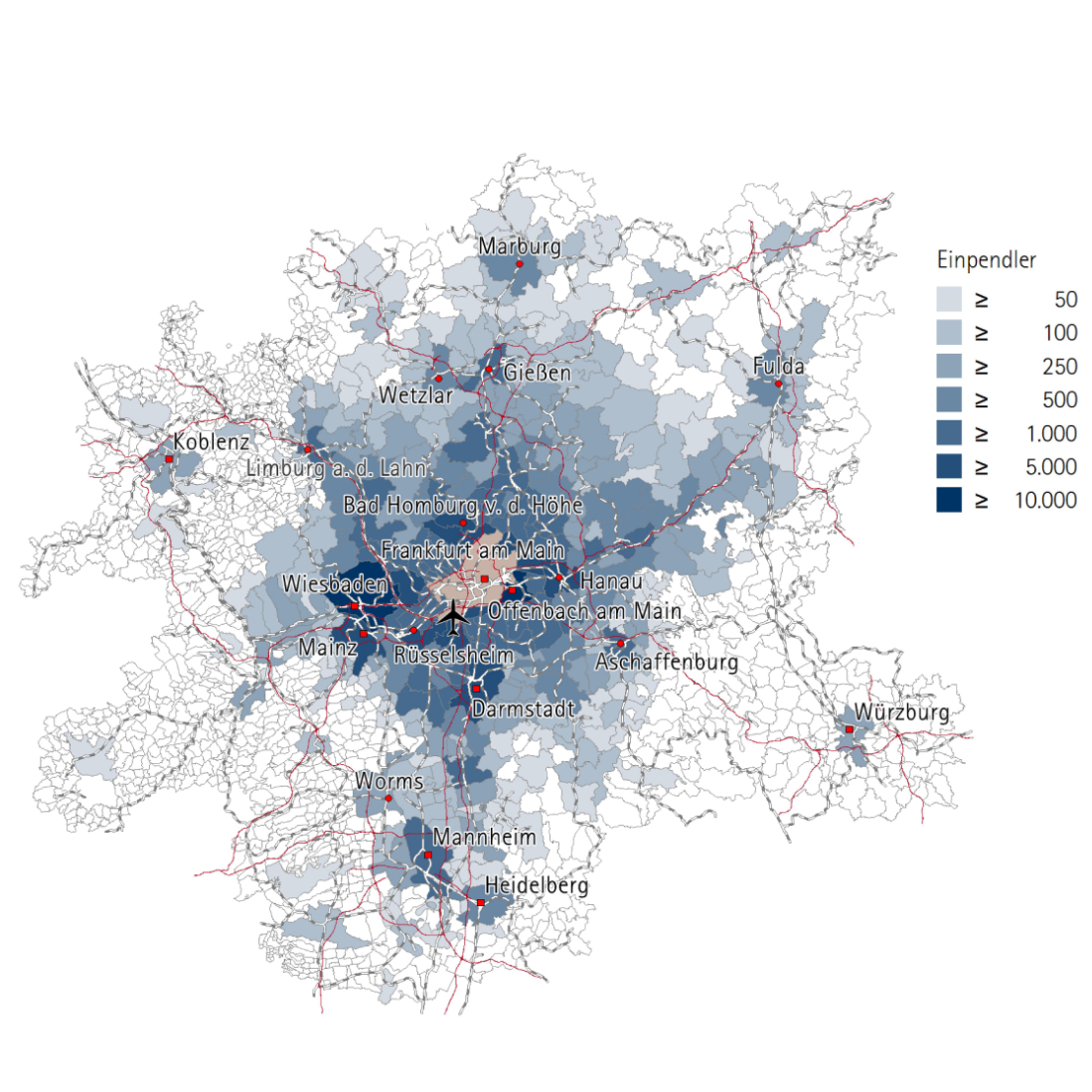 Arbeitspendler nach Frankfurt am Main, © IHK Frankfurt am Main (2014): Mobile Arbeitnehmer - Pendlerverflechtungen im IHK-Bezirk Frankfurt am Main