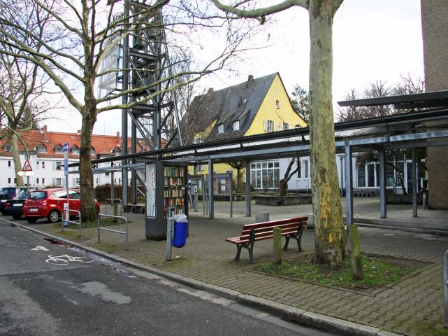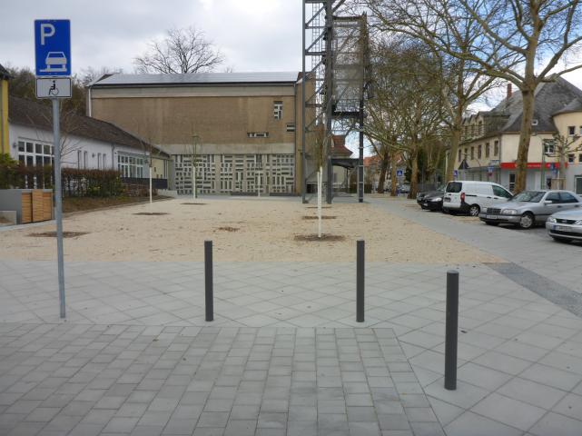 Der Freifläche vor der evangelischen Kirche kommt eine besondere Bedeutung im städtebaulichen Gefüge zu. Mit den Baumpflanzungen auf der ehemaligen Grünfläche vor dem Gemeindehaus wurde ein städtebauliches Ensemble aus Kirchengebäude, Platz und Baumhain geschaffen. Der zentrale Kirchenvorplatz bildet das stadträumliche Pendant zum Platz Am Erlenbruch.