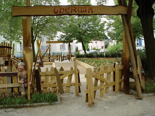 Schloss Schlotterland mit angrenzender Aktionsfläche aus Wippe, Schaukeln, Kletterstäben richtet sich an acht- bis zwölfjährige Kinder. Durch Einbindung eines Teilstücks der Kleingartenfläche konnte ein zusammenhängender Spielbereich am Ende des Cheruskerwegs gestaltet werden.