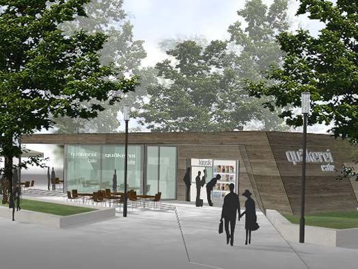 Zur weiteren Stabilisierung des nachbarschaftlichen Lebens sollte der geplante „Quartierspavillon Quäkerwiese“ ein Treffpunkt für alle BewohnerInnen auch über die Zeit nach der „Sozialen Stadt“ werden. Die dauerhafte Integration des vormals im Kioskcontainer untergebrachten „Café Pause“ sollte den Stadtteiltreffpunkt funktional unterstützen und gastronomisch ergänzen.