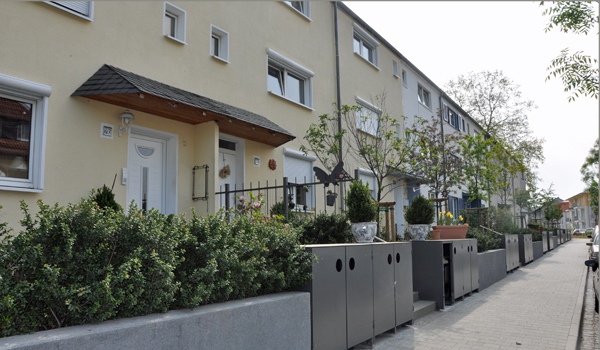 In einem ersten Schritt wurde in 2008 mit der Projektentwicklung für eine funktionale und gestalterische Aufwertung der Vorgartenzone begonnen. Das Büro Wittich wurde beauftragt, ein Planungskonzept zu erstellen. Darauf aufbauend wurde in einem interaktiven Prozess mit den Anwohnern ein tragfähiges Gesamtkonzept entwickelt und der weiteren Ausführungsplanung zugrunde gelegt: Die Stützmauer wurde um 2,50 m auf die neue Grenze zwischen Straße und Vorgarten versetzt und durchgängig mit einer Hecke hinterpflanzt. Jeweils 2 Häuser teilen sich einen gemeinsamen Hauseingang. In den neuen Mauerverlauf wurden Müllboxen aus Stahlblech integriert, so dass zur Straße hin ein hochwertiger und geschlossener Abschluss entsteht. Nach den Landschaftsbauarbeiten folgte im Frühjahr 2010 die Bepflanzung der Vorgärten. In jedem Vorgarten wurde ein individuell ausgewählter Hausbaum gesetzt  und nach Wunsch ein kleiner Sitzplatz eingerichtet.