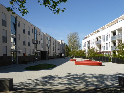 Die Gestaltung des Platzes ist ruhig und klar und respektiert die raumgebenden Platzwände. Eine sanft steigende Treppenanlage mit langgezogenen Stufen überwindet den Höhenunterschied am Platzeingang zum Alemannenweg. Der barrierefreie Zugang erfolgt über eine Rampe, über die auch das erste Haus der südlichen Platzbebauung erschlossen wird. Gezielt eingesetzte Gestaltungselemente akzentuieren die Raumfolgende des Platzes und schaffen ein größtmögliches Maß an Freizeitqualität. Durch raumwirksame Grünelemente (linear angeordnete Gehölze/ dispers verteilte Laubbäume/ Rasenhügel als Verbindungselement zum Grünraum) ist ein qualitätsvoller Ort entstanden, der offen ist für temporäre Nutzungen. Ein besonderer Blickpunkt sind die rot durchfärbten Sitzelemente aus Beton, die unter den Bäumen angeordnet sind.