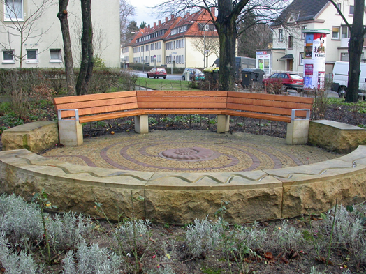 Im Halbschatten alter Linden wurde ein kreisrunder Sitzplatz geschaffen, von dem aus man das Geschehen im Park beobachten kann. Ein spiralförmiges Pflastermuster ziert den Platz. Von der halbrunden Bank schweift der Blick über ein kleines Hochbeet mit Bütensträuchern. Die Einfassung ist aus künstlerisch bearbeitetem Sandsteinquader.