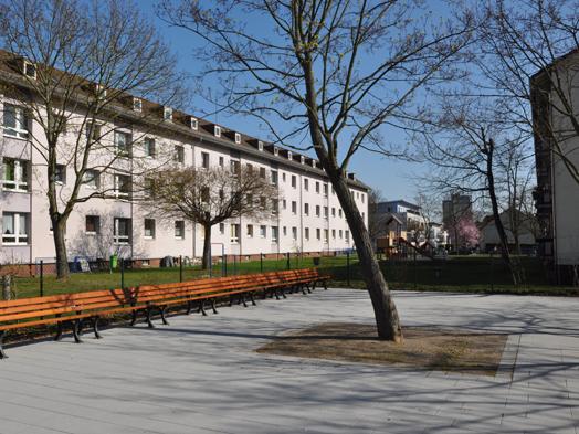 • Platzmitte mit angrenzendem Grünraum, © Stadtplanungsamt Stadt Frankfurt am Main