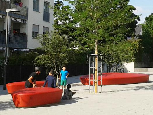 • Gestaltungsdeteil:Sitzelemente aus rotem Beton, © Stadtplanungsamt Stadt Frankfurt am Mai