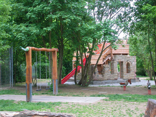 Schloss Schlotterland mit angrenzender Aktionsfläche aus Wippe, Schaukeln, Kletterstäben richtet sich an acht- bis zwölfjährige Kinder. Durch Einbindung eines Teilstücks der Kleingartenfläche konnte ein zusammenhängender Spielbereich am Ende des Cheruskerwegs gestaltet werden.