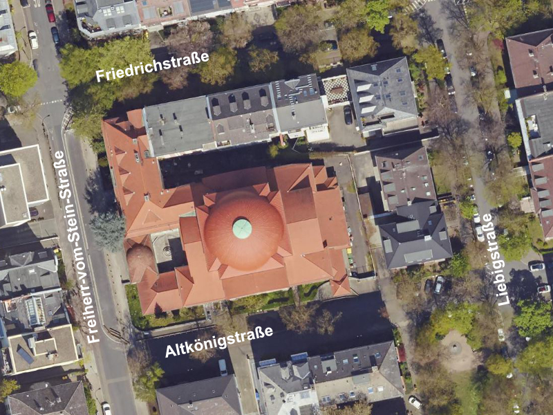 Das Entwurfsgebiet umfasst die im Luftbild gekennzeichneten Straßenräume im Bereich der Synagoge und ihren angegliederten Gebäuden. Es hat eine Größe von rund 2.500 qm. In der Altkönigstraße reicht es bis an die Liebigstraße. In der Friedrichstraße erstreckt es sich bis zur Hausnummer 27. Die Grunderneuerung der betreffenden Straßenräume ist Teil der Planungsaufgabe.