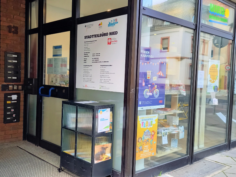 - Quartiersmanagement mit Stadtteilbüro (Alt-Nied 13) von Caritasverband Frankfurt e.V. als Anlaufstelle vor Ort mit Angebot zur Sprechstunde, moderierten Bewohnertreffen und Begleitung und Durchführung vielfältiger lokaler Kleinprojekte