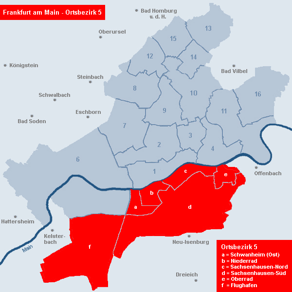 Der Ortsbezirk 5 (Süd) umfasst die Stadtteile Niederrad, Oberrad, Sachsenhausen-Nord, Sachsenhausen-Süd und Flughafen sowie den östlichen Bereich des Stadtteils Schwanheim bis zur Autobahntrasse A5.