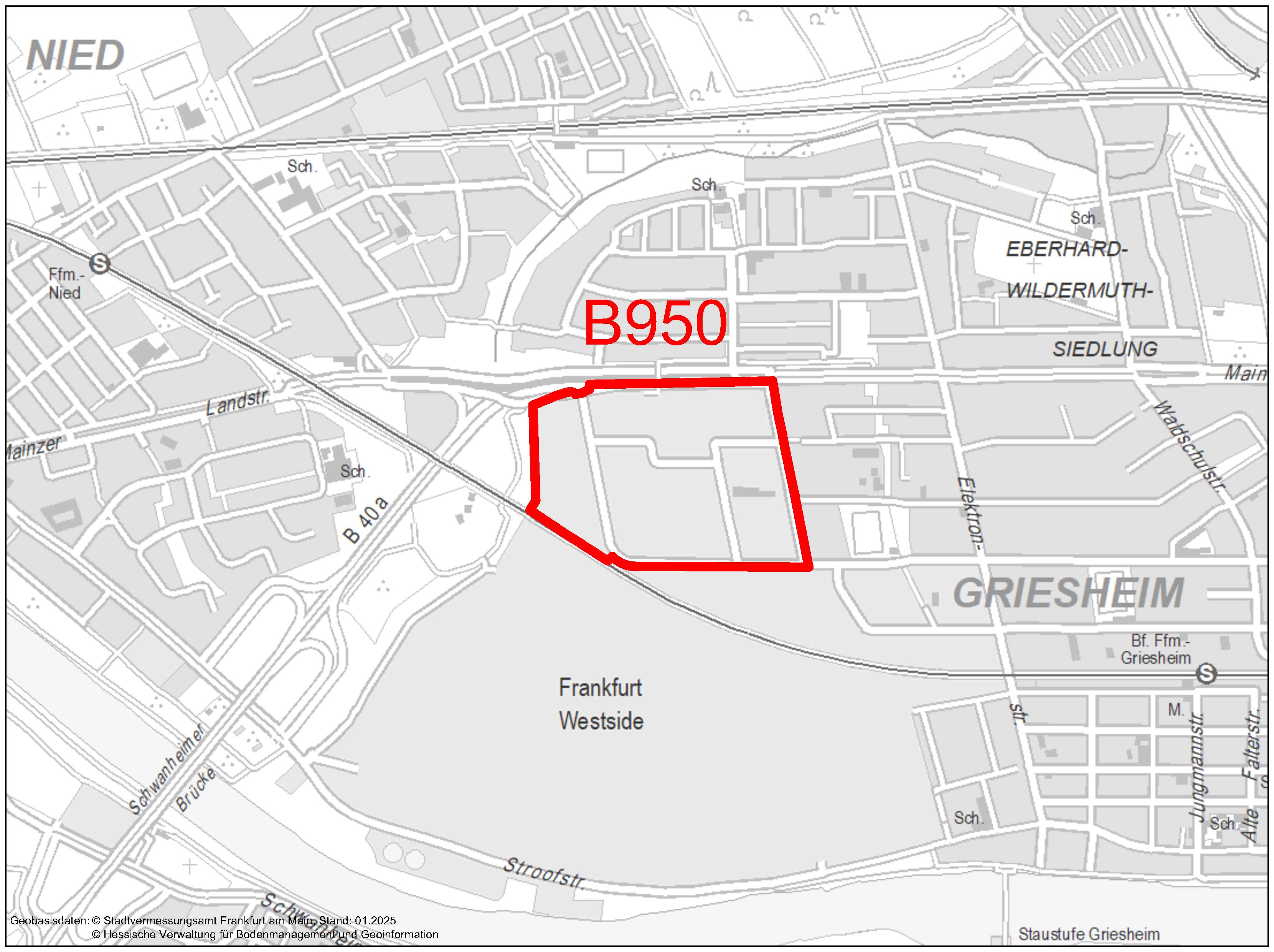 Die Beschlussfassung über die Aufstellung des Bebauungsplanes Nr. 950 - Südlich Mainzer Landstraße / Westlich In der Schildwacht - wurde am 17.02.2026 im Amtsblatt Nr. 8 der Stadt Frankfurt am Main bekannt gemacht.