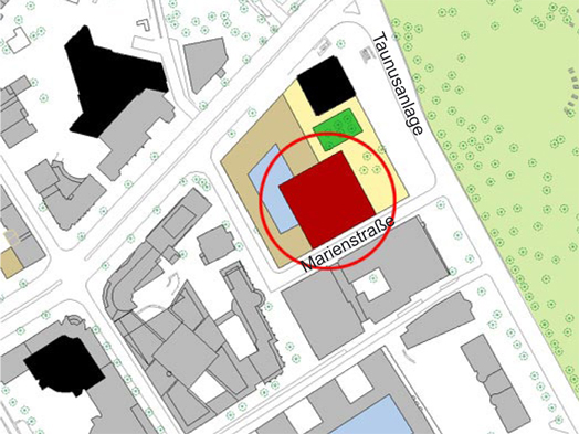 Der Standort zwischen Mainzer Landstraße und Marienstraße befindet sich im Schnittpunkt zweier stadträumlich prägender Achsen: zum einen die Mainzer Landstraße mit der Reihung von Hochhäusern auf ihrer Nordseite, zum anderen die Hochhäuser beiderseits der Taunusanlage. An dieser einmaligen stadträumlichen Situation bietet sich die Ausbildung eines prägenden gestalterischen Gelenkpunktes an, der das Hochhauscluster Bankenviertel mit der Achse Mainzer Landstraße sinnvoll verknüpfen kann.