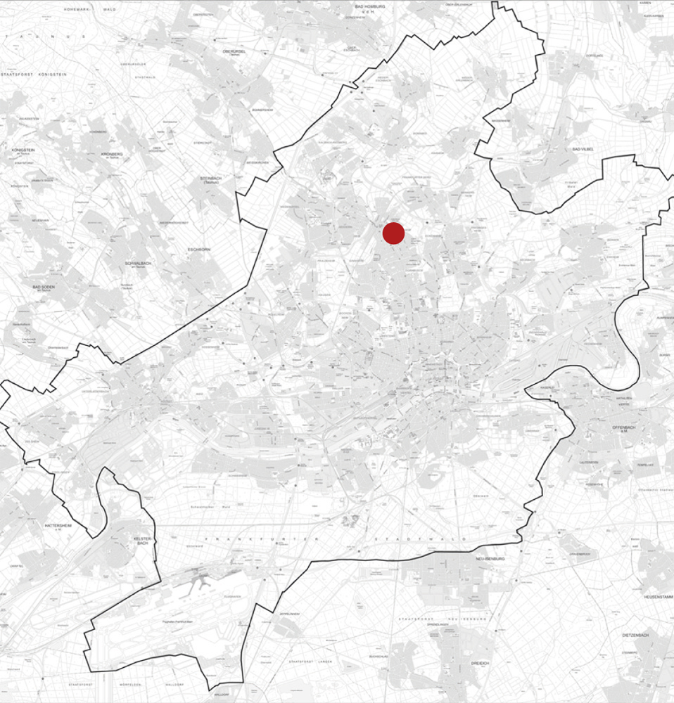 Das Plangebiet liegt am Ortsrand des Stadtteils Eschersheim. Die Grenze des Plangebiets verläuft von Westen nach Osten zwischen der Bundesautobahn A 661 und der Straße Am Gabelacker. Im Süd-Westen schließt das Gebiet an die bestehende Bebauung nördlich der "Anne-Frank-Siedlung" an. Im Nord-Westen wird das Plangebiet durch den Berkersheimer Weg begrenzt, der die Stadtteile Erschersheim und Frankfurter Berg miteinander verbindet.