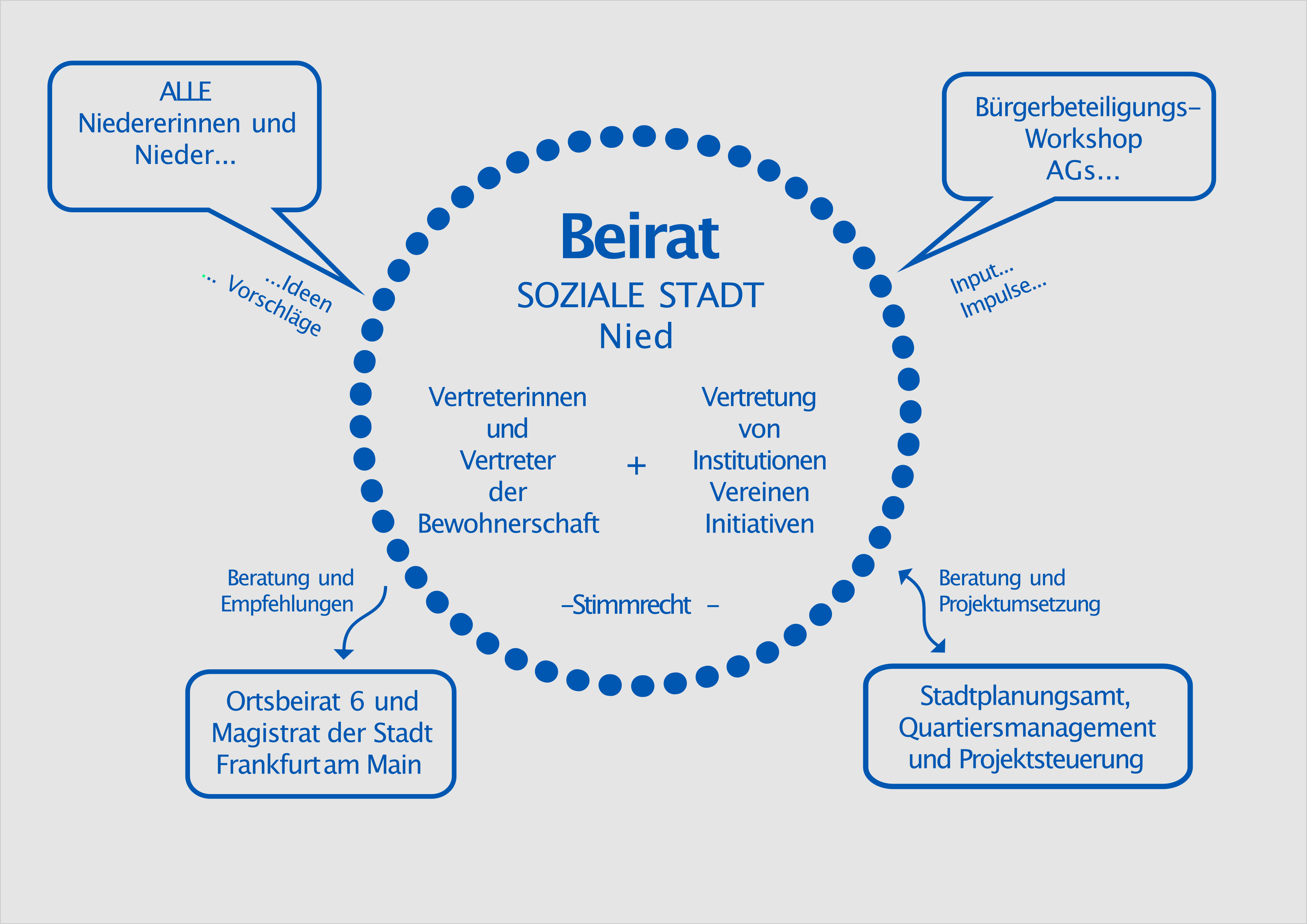 Der Stadtteilbeirat vertritt während der Programmlaufzeit die Interessen der Bürgerinnen, Bürger und örtlichen Institutionen. Hier tauschen sich die Vertreterinnen und Vertreter des Stadtteils aus. Die Mitglieder des Beirats vertreten die Interessen des Gebiets und beraten über Projektvorschläge sowie notwendige Entwicklungen im Stadtteil. Der Beirat trifft sich regelmäßig und tagt öffentlich, um die Anregungen der Niederinnen und Nieder in das Projekt Sozialer Zusammenhalt Nied einzubringen.