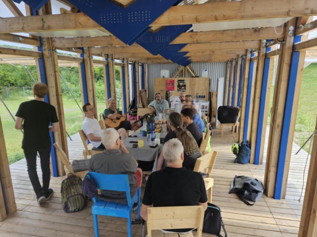 Civic participation in planning the long-term solution for the district café / neighborhood meeting point took place at the Advisory Council in 2024 and during the “Lakeside Picnic” in summer 2025. Anyone interested was able to view a 3D model of the proposal submitted by AB2P as the architects commissioned to plan the building and walk through it virtually using VR goggles. Moreover, the architects were at hand to answer questions and discuss thing.