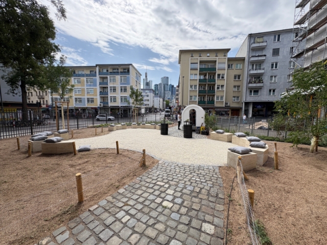Der an die Fahrgasse angrenzende Platz an der Staufenmauer wurde im Frühjahr 2025 umgestaltet. Heute ist er ein besonderer Ort zum ruhigen Verweilen im Schatten mit Blick auf die historische Staufenmauer. Auf diesem sehr sonnigen und im Sommer auch heißen Platz werden zwei neue japanische Schnurbäume zukünftig mehr Schatten liefern können. Hinzu kommen dekorative Staudenpflanzungen und Blühwiesenflächen. Sie werden hier eine kleine grüne Oase im Kontrast zur geschäftigen Flaniermeile der Zeil anbieten. Ein Espressomobil betreut den Freiraum ohne Konsumzwang. Eine Informationsstele bietet interessierten Besuchern Auskünfte zur Geschichte des Ortes.